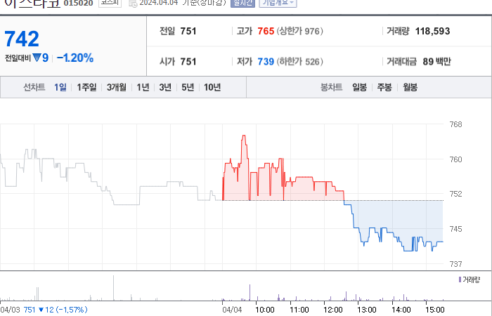 이스타코의 현재 주가는 751원이며 전일 대비 -12원으로 하락하고 있습니다. 주주현황을 살펴보면 김승제(외 3인)이 지분의 25.84%를 소유하고 있습니다. 이스타코는 부동산 기업으로, 현재 장중 기준 주가는 751원입니다. 시가 총액은 318억 원이며 발행 주식수는 42,851,600주입니다. 외국인 보유 비중은 0.28%이며, 장중 거래량은 100,809주를 기록했습니다. 또한, 이스타코는 매출액으로 133억 원을 달성했습니다.