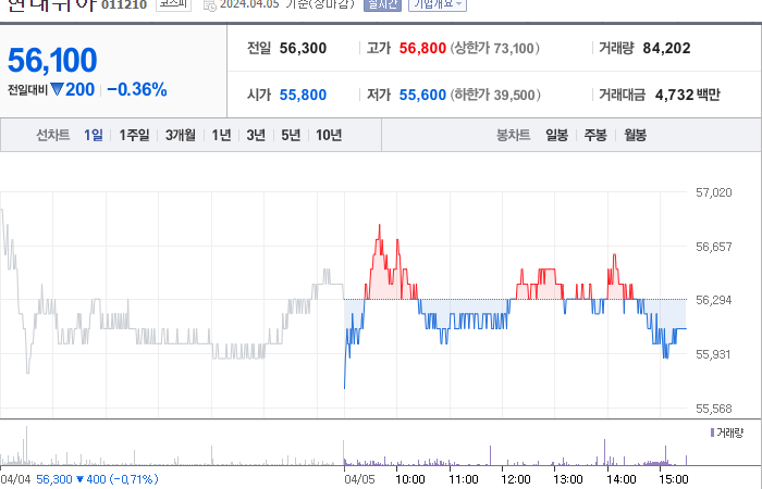 현대위아의 현재 주가는 56,100원이며 전일 대비 -200원으로 하락하고 있습니다. 현대위아의 대주주는 현대자동차(외 2인)로 지분 40.74%를 소유하고 있습니다. 현대위아는 자동차 부품 기업으로 장중 기준 주가는 56,100원입니다. 시가 총액은 1조 5256억 원이며 발행 주식수는 27,195,083주입니다. 외국인 보유 비중은 15.35%이며 장중 거래량은 84,507주를 기록했습니다. 또한, 현대위아의 매출액은 85,903억 원을 달성했습니다.